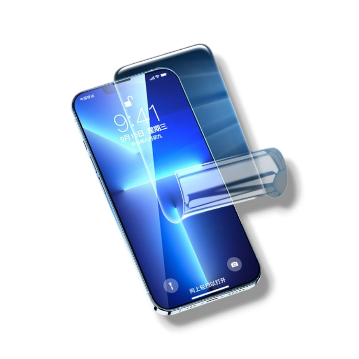 Lámina de hidrogel con endurecimiento por medio de lámpara UV, lo que hace que se active la fibra UV y quede como vidrio templado. Visión HD totalmente transparente, oleofóbica, hidrofóbica